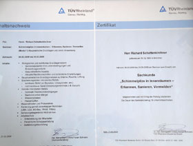 Zertifikat TÜV Rheinland: "Schimmelpilze in Innenräumen - Erkennen, Sanieren, Vermeiden"